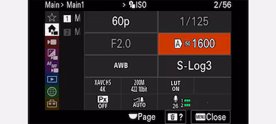 Elastyczne ISO to tryb filmowania S-Log3, w którym można ręcznie regulować przysłonę i czas migawki oraz automatycznie dostosowywać czułość do jasności sceny. ISO można ustawić na AUTO lub ręcznie zmieniać od 640 do 102 400 (160–409 600 w rozszerzonym trybie ISO), aby uzyskać optymalne naświetlenie.