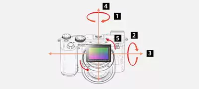 5-osiowa stabilizacja ułatwia uzyskanie wyraźniejszych zdjęć zbliżeniowych, nocnych widoków i fotografii robionych z użyciem zoomu. Kompensacja jest odpowiednikiem skrócenia czasu otwarcia migawki o 5,0 stopni. [1] Pochylenie / [2] Odchylenie: przy długich ogniskowych, [3] Poziomo / [4] Pionowo: przemieszczenia w górę / w dół i na boki przy zdjęciach zbliżeniowych i makro, [5] Obrót: obrót przy długich czasach ekspozycji