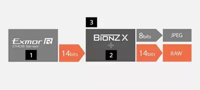 Aparat α7R IV obsługuje skompresowany i nieskompresowany 14-bitowy format RAW czego efektem są płynne i bardziej naturalne przejścia tonalne zwiększające jakość obrazu. 16-bitowe przetwarzanie w procesorze obrazu BIONZ X, najnowszy układ LSI i ulepszony procesor obrazu BIONZ X umożliwiają generowanie 14-bitowych danych w formacie RAW nawet podczas sesji w trybie cichym lub zdjęć seryjnych. [1] Przetwornik obrazu [2] Najnowszy szybki układ o dużej skali integracji [3] 16-bitowe przetwarzanie obrazu