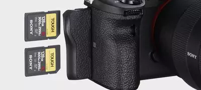 Aparat α7R IV ma dwa gniazda na karty SD — oba obsługują standard UHS-I i UHS-II, co zwiększa prędkość przesyłania danych. Dwie karty znajdujące się w gniazdach mogą zostać użyte do jednoczesnego lub naprzemiennego zapisu danych, oddzielenia danych w formacie RAW od JPEG lub zdjęć z filmów oraz do kopiowania danych pomiędzy kartami. Mechanizm blokowania przesuwania zapobiega niezamierzonemu otwarciu pokrywy karty pamięci.