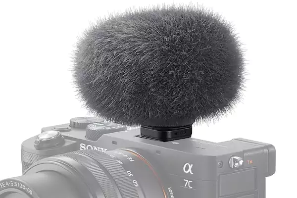 Mikrofon jest dostarczany z osłoną przeciwwiatrową, bardzo skutecznie osłabiającą odgłosy wiatru podczas filmowania na powietrzu.