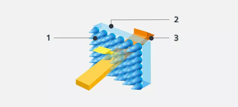 Powłoka Sony Nano AR eliminuje niepożądane odbicia, które mogą powodować powstawanie poświaty i tzw. duszków przy fotografowaniu pod światło oraz w innych wymagających warunkach, zapewniając niezmiennie wysoki kontrast i wyrazistość. Redukcja poświaty, zwłaszcza przy robieniu zdjęć w jasnych warunkach zewnętrznych, oznacza lepsze kadrowanie oraz większą elastyczność kompozycji. (1. Powłoka Nano AR / 2. Szkło / 3. Światło przechodzące)