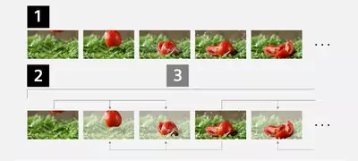 Podczas nagrywania na wewnętrzny nośnik obsługiwana jest nie tylko kompresja międzyklatkowa Long GOP, lecz również wewnątrzklatkowa (All-Intra) z niezależną kompresją każdej klatki przy dużej przepływności — do 600 Mb/s. Tryb XAVC S-I idealnie nadaje się zatem do utrwalania szybkiego ruchu. Zapewnia też maksymalną elastyczność i jakość obrazu w postprodukcji. [1] All-Intra (All-I)  [2] Long GOP  [3] Grupa obrazów (GoP)