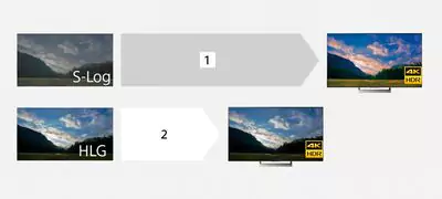 Profil obrazu HDR HLG (Hybrid Log Gamma) oraz szeroka przestrzeń barw BT.2020 umożliwiają nagrywanie ujęć HDR (HLG) przeznaczonych do bezpośredniego wyświetlenia na kompatybilnym telewizorze. Uzyskiwany w ten sposób wierny obraz nie wymaga korekcji kolorystyki i przypomina to, co widzi nieuzbrojone oko. Zawiera dużo szczegółów w ciemnych i jasnych częściach oraz mniej całkowicie niedoświetlonych i prześwietlonych fragmentów. Niezwykle realistyczne są zwłaszcza 10-bitowe nagrania, zapewniające dużą szczegółowość i płynność przejść tonalnych.  [1] Duża swoboda obróbki obrazu (wymagana korekcja barw) [2] Obraz o wysokiej jakości niewymagający korekcji barw