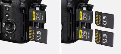 Kamera jest wyposażona w dwa gniazda na nośniki obsługujące zarówno karty CFexpress typu A, jak i karty SDXC/SDHC klasy UHS-I i UHS-II. CFexpress typu A to nowy standard kompaktowych nośników danych odznaczających się dużą prędkością zapisu i odczytu. Można na nie nagrywać filmy 4K o dużej przepływności. Dwa gniazda dają możliwość zapisu naprzemiennego lub równoczesnego.