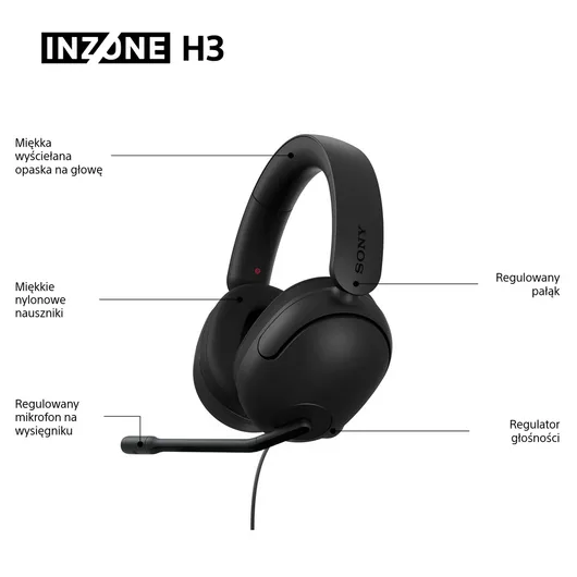 Sony INZONE H3 to przewodowe, zamknięte słuchawki gamingowe z dynamicznymi przetwornikami 40 mm i czułością 92 dB, które oferują wyraźny dźwięk oraz pełne pasmo 10–20 000 Hz. Mają mikrofon na wysięgniku z możliwością wyciszenia, regulację głośności i wygodny przewód 1,2 m z pozłacanym wtykiem. Słuchawki obsługują też technologię dźwięku przestrzennego 360° do gier i są zaprojektowane z myślą o wielogodzinnej wygodzie podczas grania.