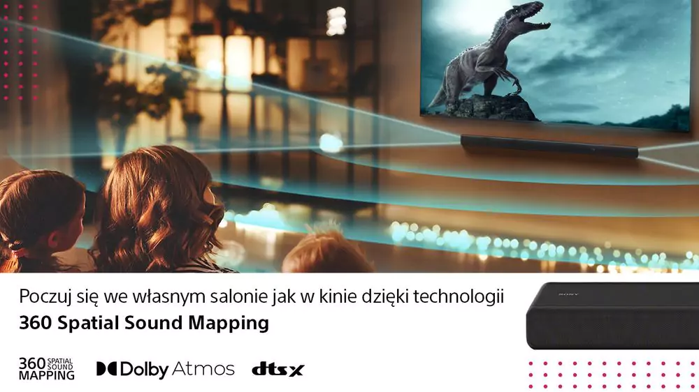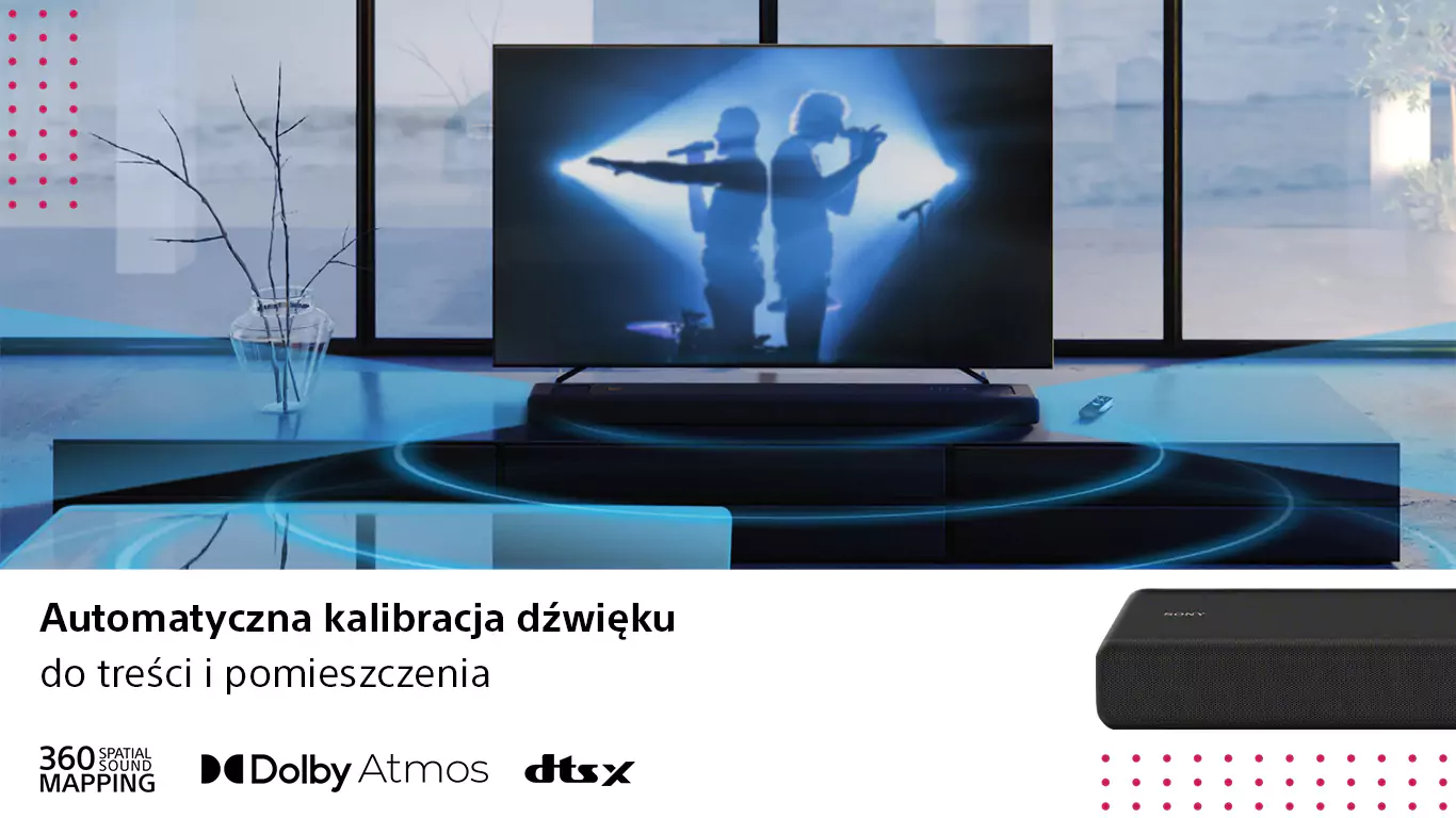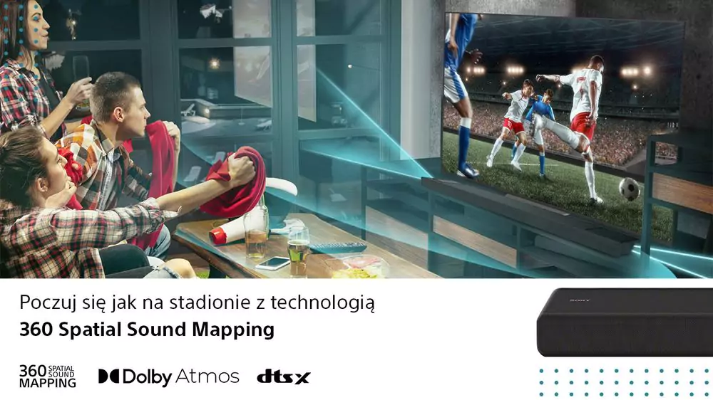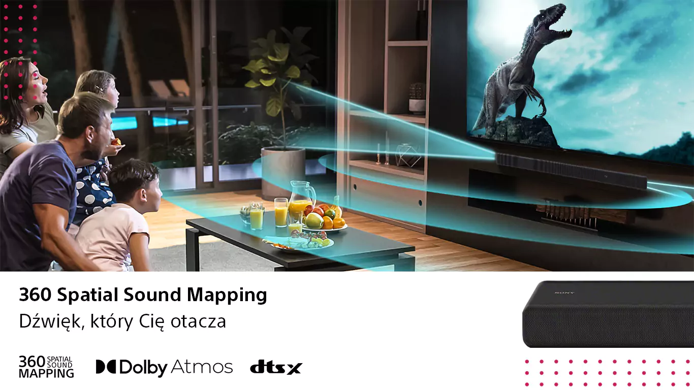 W połączeniu z tylnymi głośnikami Sony rewolucyjna technologia 360 Spatial Sound Mapping wytwarza wiele pozornych głośników z dźwięku z samego soundbara i tylnych głośników. Dzięki tym pozornym głośnikom, rozmieszczonym wokół Ciebie w polu dźwiękowym zoptymalizowanym do otoczenia, słuchanie staje się nowym doświadczeniem. Poczuj dramatyzm dźwięku Dolby Atmos® i DTS:X®. Usłysz każdy oddech, każdy krok, każde słowo i poczuj się uczestnikiem filmu.
