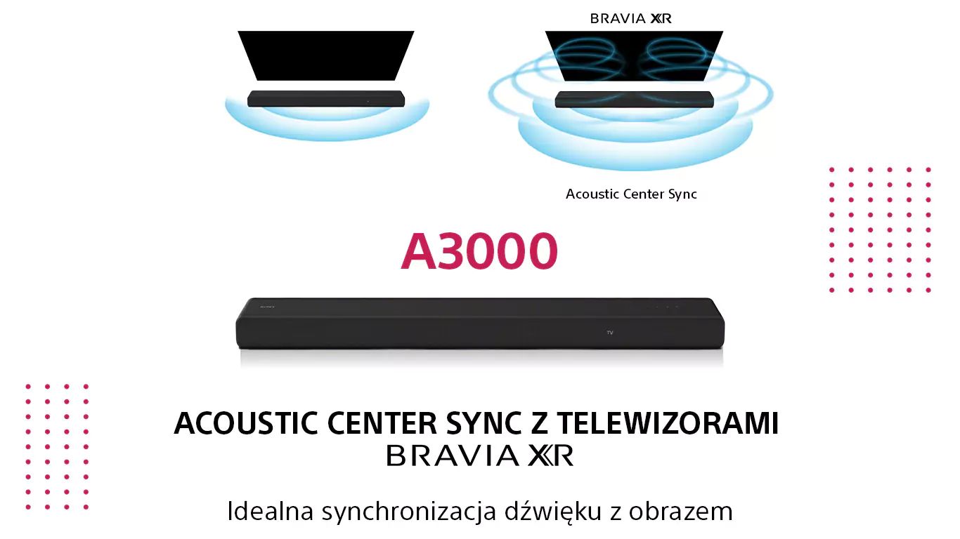 W połączeniu ze zgodnym telewizorem Sony BRAVIA soundbar HT-A3000 zapewnia niesamowity realizm audiowizualny dzięki technologii Acoustic Center Sync. Dźwięk akcji na ekranie, jest precyzyjnie pozycjonowany zarówno za pomocą soundbara, jak i głośników telewizora, zapewniając wyjątkowe wrażenia z filmów, muzyki i gier