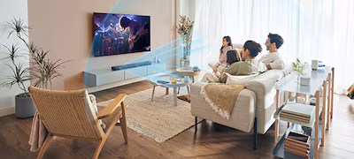 3.1-kanałowy soundbar z technologiami S-Force PRO Front Surround, Vertical Surround Engine, 360 Spatial Sound Mapping (z dodatkowymi bezprzewodowymi tylnymi głośnikami) i optymalizacją pola brzmieniowego (z dodatkowymi głośnikami).