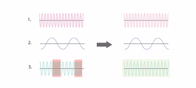 Im głębszy bas, tym mocniejsze ruchy membrany głośnika. Jeśli w tym samym czasie membrana pełnozakresowa odtwarza wyższe częstotliwości, mogą wystąpić zakłócenia w modulacji fazy. Opracowana przez Sony technologia przetwarzania sygnału kompensuje to zjawisko, poprawiając słyszalność dialogów i rozmieszczenie źródeł dźwięku. Korekta zmodulowanego sygnału zwiększa czystość brzmienia i zapobiega zniekształcaniu głosu. Wykres służy do celów ilustracyjnych. 1. Przebieg fali — głos 2. Przebieg fali — bas 3. Zmodulowany przebieg