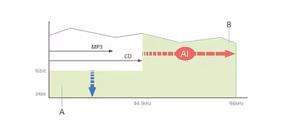 Działający w czasie rzeczywistym system DSEE Extreme™ (Digital Sound Enhancement Engine) przywraca dźwięki o wysokiej częstotliwości, które zanikają podczas kompresji. Wykorzystując technologię Edge-AI, dynamicznie rozpoznaje instrumentację, gatunek muzyczny i indywidualne cechy utworu, jak wokale i interludia. Rezultat to bogatsze, pełniejsze wrażenia podczas słuchania. A = Rozszerzona dynamika dźwięku (instrumenty smyczkowe i dźwięki na poziomie szeptu) B = Przywrócone wysokie częstotliwości (realizm akustyki, instrumentów i wokali)