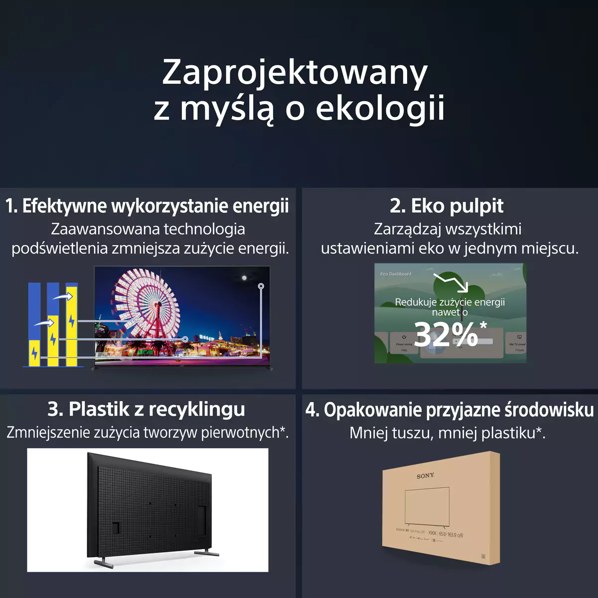 *Porównanie ustawień fabrycznych z najbardziej energooszczędnymi ustawieniami za pomocą ECO Dashboard. Zmierzono na modelu 85X95L, wartość może się różnić w zależności od modelu. Wybór funkcji Eko może wpłynąć na jasność oglądanych scen.