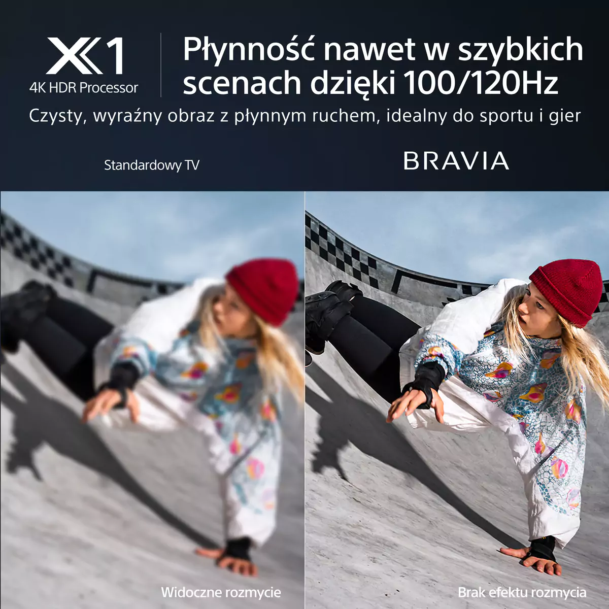 Obraz dynamicznych, szybkich scen w X85L jest płynny, wyraźny i pozbawiony rozmycia. Ludzkie oko może dostrzec lekkie “szarpanie” obrazu, gdy klatki nie są do siebie dopasowane lub gdy spada jasność. Nasza technologia XR Motion Clarity wykorzystuje inteligentne przetwarzanie ruchu dla szybko poruszających się obiektów w całym kadrze, utrzymując płynność i jasność obrazu. Oznacza to, że zobaczysz każdy sprint lub skok bez rozmycia — dokładnie tak, jakbyś był na miejscu zdarzenia.