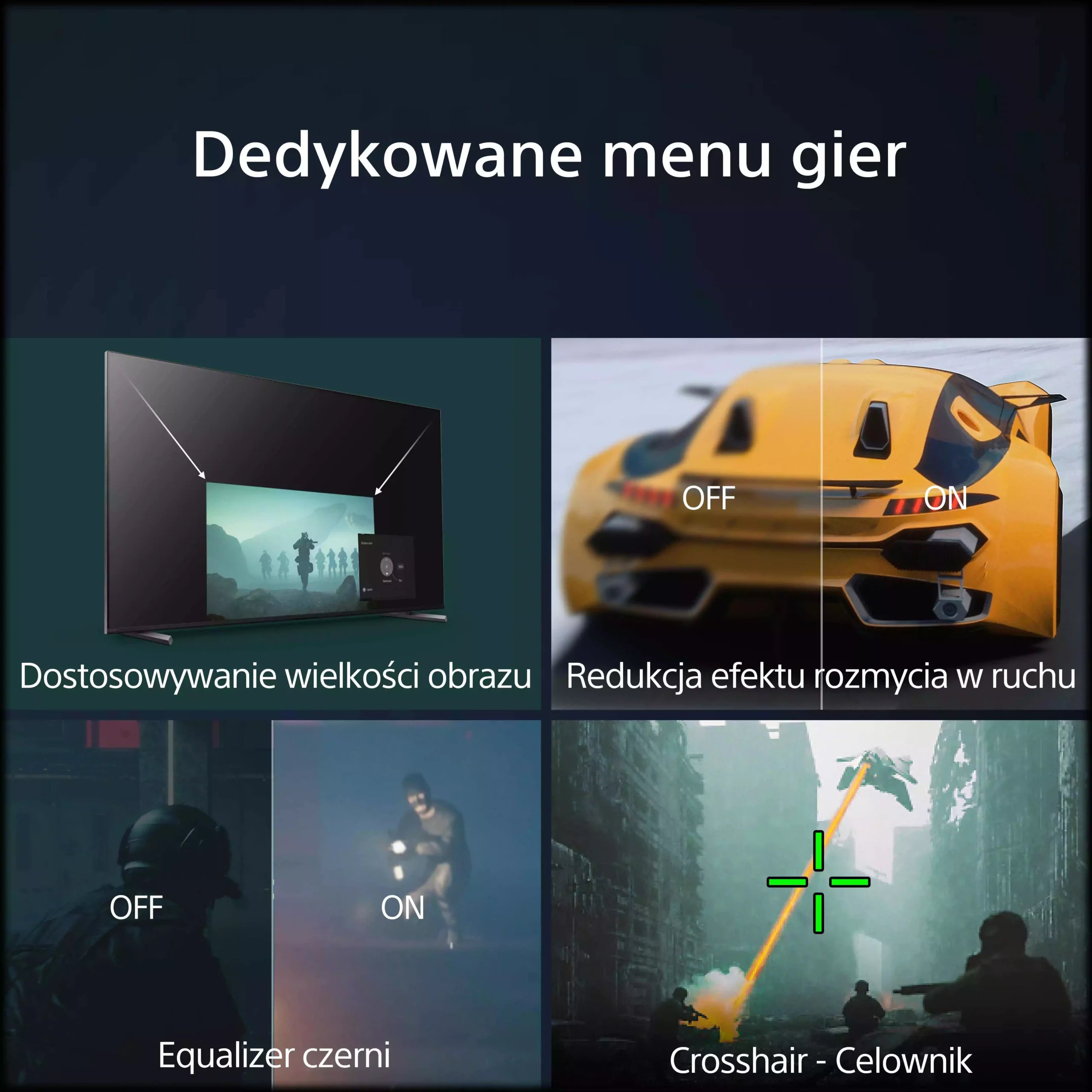 Tutaj, w jednym miejscu znajdziesz wszystkie ustawienia, których potrzebujesz, aby zoptymalizować swoją wydajność w grach. Obejmuje to VRR (włączony lub wyłączony), Motion Blur Reduction, który lekko przyciemnia ekran w celu poprawy płynności obrazu, Black Equaliser, aby rozjaśnić ekran i ujawnić ukryte obiekty w grze i wiele innych. Dodaliśmy także konfigurowalną funkcję celownika “Crosshair” w sześciu różnych stylach, która pomoże Ci udoskonalić celowanie. Nasza nowa funkcja Custom Screen może być sekretem Twojego kolejnego zwycięstwa! Zmieniaj rozmiar ekranu, maksymalizując go, gdy chcesz zobaczyć więcej szczegółów w każdym fragmencie gry, lub minimalizując, gdy musisz skupić wzrok na przeciwniku.