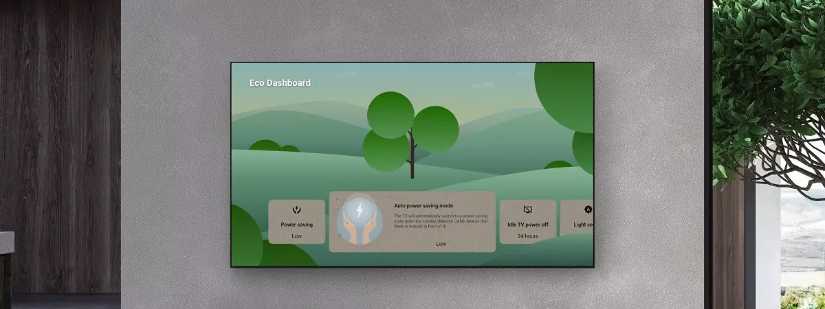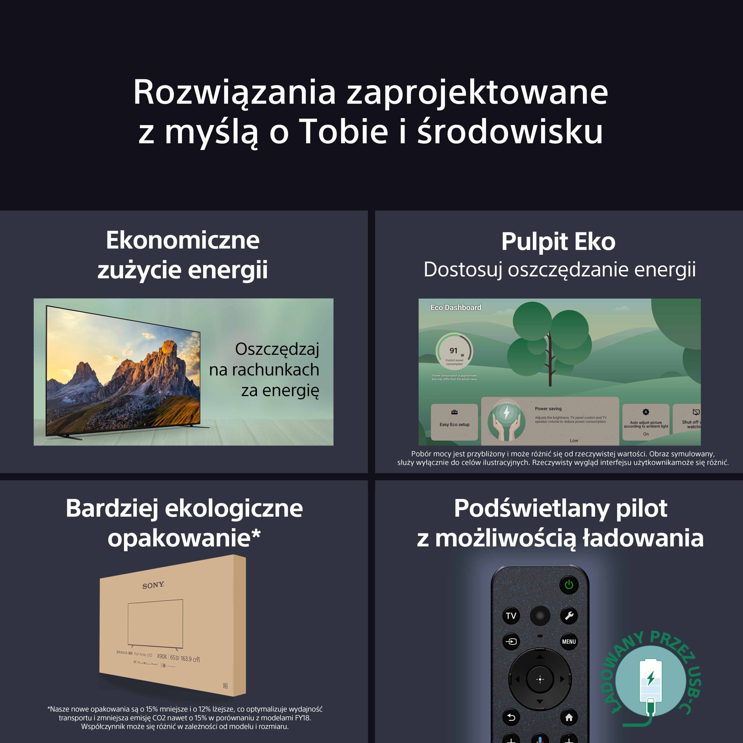 Telewizor Sony BRAVIA 7 65 cali K-65XR70 ma nowoczesny pilot Eco Remote wykonany w 80% z plastiku z recyklingu, ładowany przez USB-C. Inteligentne zarządzanie energią pozwala oszczędzać prąd i zmniejszyć emisję CO2 dzięki panelowi Eko.