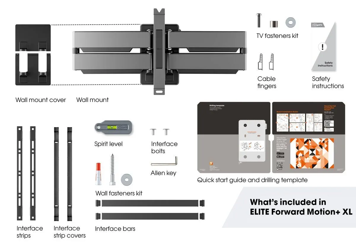 Uchwyt ścienny serii ELITE Forward Motion TV jest łatwy w instalacji, dzięki dołączonej do niego skróconej instrukcji instalacji oraz szczegółowej instrukcji i materiałom wideo z przebiegu instalacji dostępnym online. W zestawie znajdują się wszystkie niezbędne materiały montażowe: poziomica, szablon z rozstawem otworów montażowych, ekstra szeroka płyta ścienna, śruby i kołki Fischer® DuoPower. Dzięki naszej bezpłatnej aplikacji DrillRight wyznaczenie pierwszego otworu jest banalnie proste. Uspokajający szczegół: miękkie plastry na uchwycie ściennym zapobiegają zarysowaniu tylnej części telewizora podczas montażu.